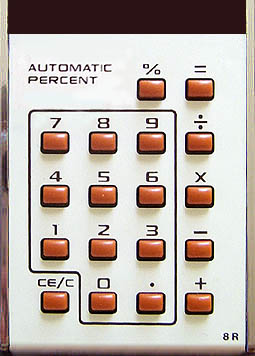 This 8R was made at the Portsmouth factory, and is a basic four function model with an added percent. Quite an angular design which I don't think is quite as sleek as the Anita handheld range, but still evocative of the 'space age' that Rockwell was famously part of. Note that the '=' key is positioned top right, rather than the now standard bottom right. This may be because it is an additional key, along with '%', over the 10R, which doubles up the '+' key for equals. The same is true of the 18F, but had moved by the 21R model. This calculator has its I.C. labelled 7542 (1975 week 42). The printed circuit boards on the Rockwells don't seem to have an assembly date.