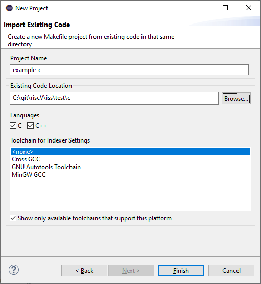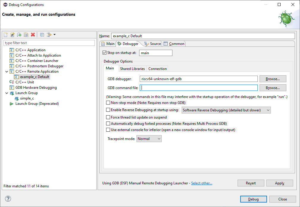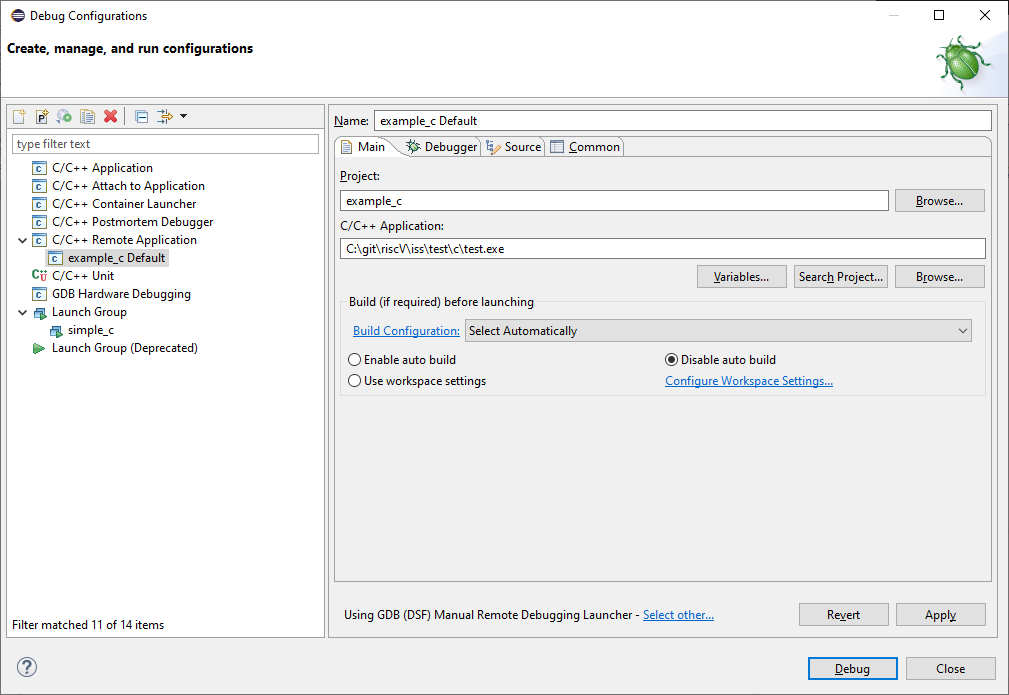 Configurations., and create a new C/C++ Application, naming it rv32iss. On the Main sub-tab, for the C/C++ Application field, Browse. to debug build of rv32.exe. Also, disable auto build. In the Arguments sub-tab, set to: