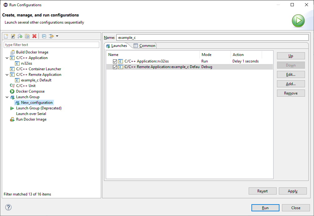 Configurations. and create a new Launch Group which we can also name example_c. In the Launches sub-tab click the Add. button. In the pop-up
